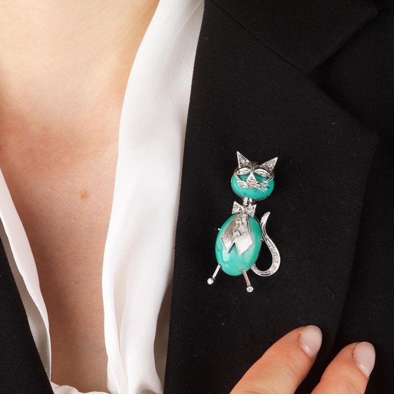 SPILLA A FORMA DI GATTO CON TURCHESI E DIAMANTI