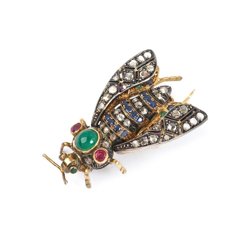 SPILLA A FORMA DI GRANDE MOSCA CON PIETRE DI COLORE E DIAMANTI in oro e argento, impreziosita da smeraldi taglio rotondo e cabochon per ct 0.70 circa, zaffiri e rubini taglio rotondo per ct 1 circa e rose di diamante, dim. cm 3x5,5, gr. 24