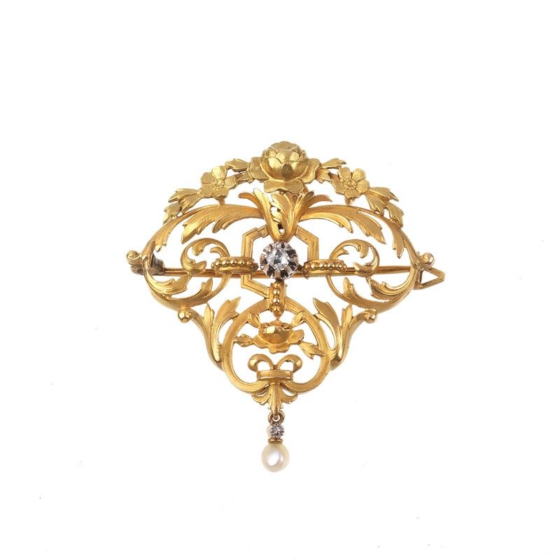 in oro giallo 18kt, con al centro una rosa di diamante, punzone francese e 750, dim. cm 3,5x4, gr. 6