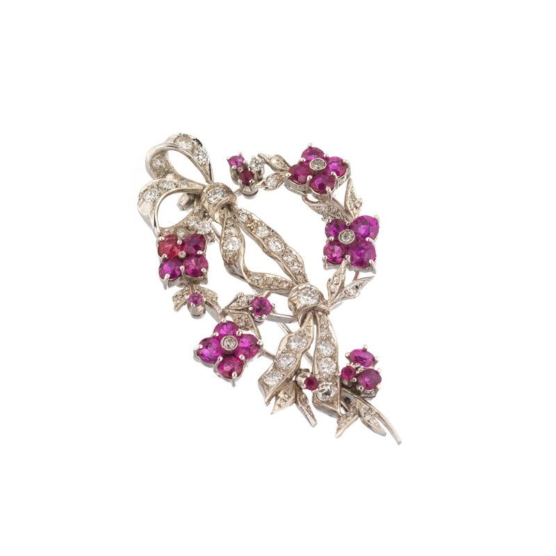 SPILLA FLOREALE CON RUBINI E DIAMANTI in oro bianco 18kt, realizzata a forma di fiocchi e tralci fioriti, impreziosita da rubini taglio rotondo per ct 2.20 circa e diamanti taglio vecchio per ct 0.90 circa, dim. cm 5x3 circa, gr. 11