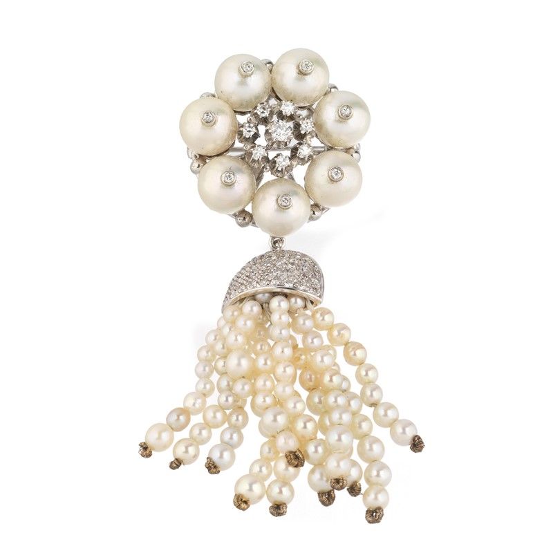 SPILLA/PENDENTE CON PERLE E DIAMANTI in oro bianco 18kt, impreziosita da perle di mm 8 circa e diamati taglio brillante e huit huit per ct 0.80 circa, da cui pende un ciondolo realizzato a frange di piccole perle leggermente digradanti di mm 4-3 circa, punzoni 750 e del fabbricante, dim. cm 3x7 circa, gr. 27