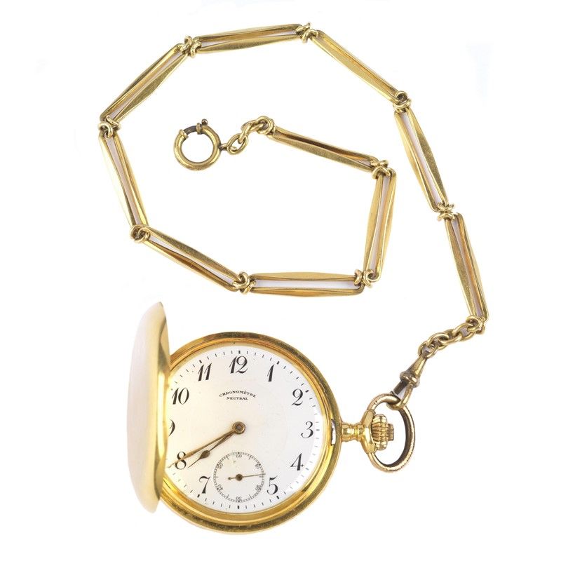 CHRONOMETRE NEUTRAL OROLOGIO DA TASCA CON CATENA cassa in tre parti in oro giallo 18kt, quadrante bianco, numeri arabi, secondi a ore sei, movimento a carica manuale, gr. orologio 85, corredato di catena in oro giallo 18kt a lunghe maglie dal motivo geometrico, gr. 28, lungh. cm 37. Diam. mm 50