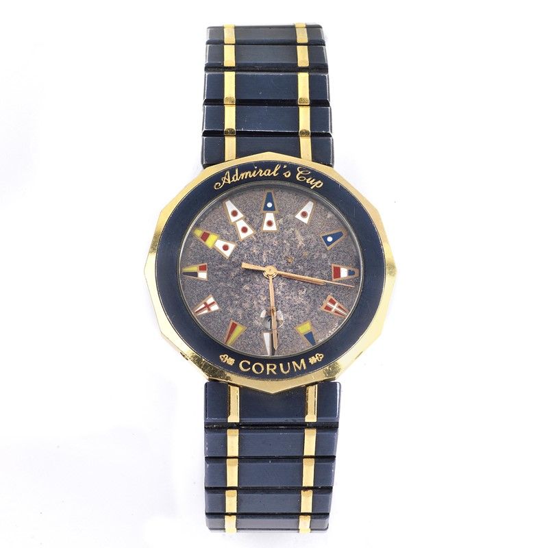 cassa in acciaio pvd blu, fondello serrato con viti, lunetta in acciaio pvd blu e placcata in oro, firmata Corum Admiral's cup, quadrante panna, indici con bandiere marinare, datario a ore sei, movimento al quarzo, bracciale a maglie in acciaio pvd blu e placcato in oro, lungh. interna cm 20, chiusura doppia deployant marcata Corum, vetro minerale. Diam. mm 34.