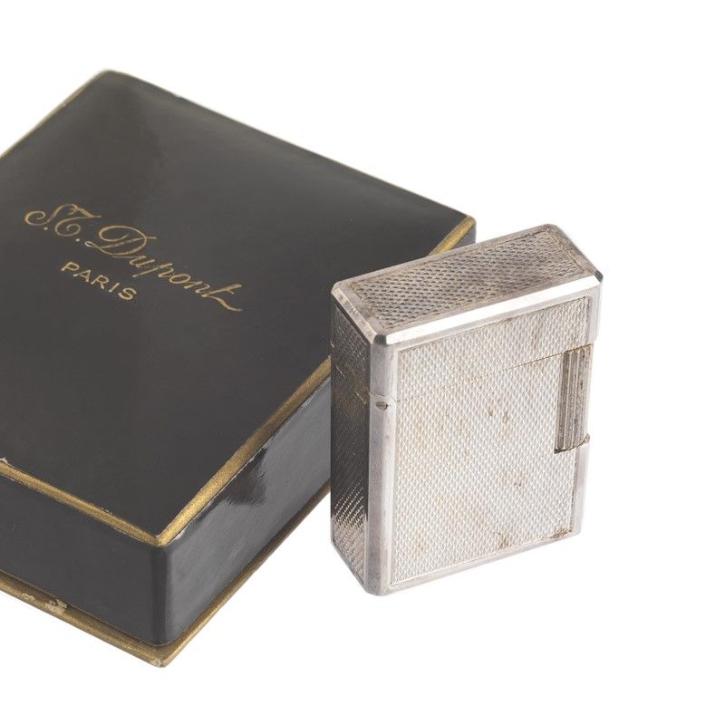 di forma rettangolare in metallo, decorato a motivo guilloché, firmato Dupont, dim. cm 3,5x4,5x1,4. Corredato di scatola.