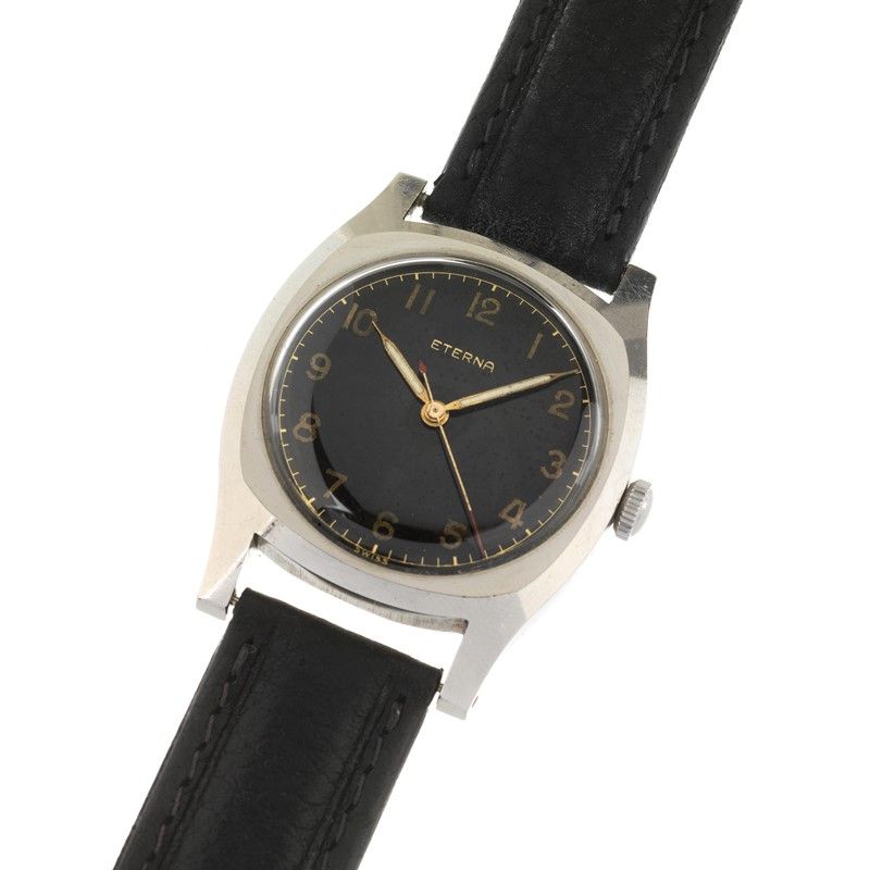ETERNA TARTARUGONE OROLOGIO DA POLSO N. 31847XX cassa in acciaio, fondello serrato a vite, lunetta liscia in acciaio, quadrante nero, grafica oro, numeri arabi al trizio, movimento a carica manuale n. 32078241, cinturino in pelle nera e fibbia in acciaio non originali, vetro plastica. Diam. mm 37
