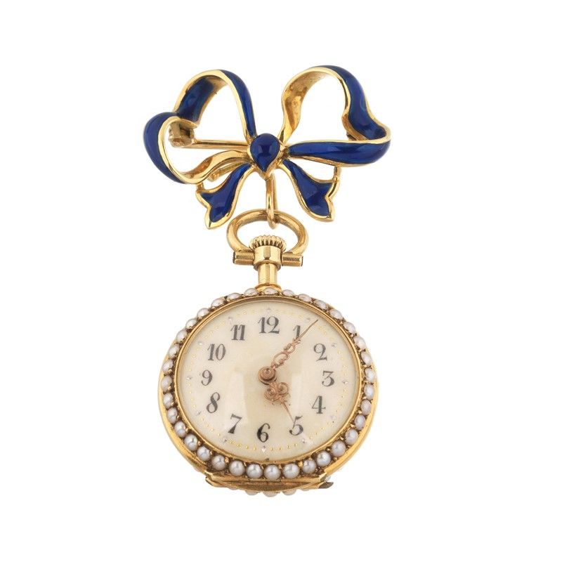 HENRY LEWIS & CO. SMALL YELLOW GOLD POCKET WATCH WITH ENAMELS AND A BOW BROOCH