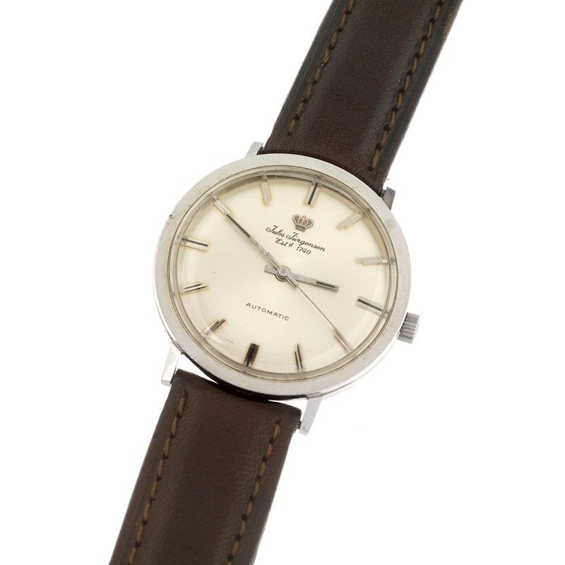 JULES JURGENSEN OROLOGIO cassa in acciaio, fondello serrato a vite, quadrante argenté, grafica nera, indici applicati, movimento a carica automatica cal AS 1748/49, cinturino in pelle marrone e fibbia in metallo non originali, vetro plastica. Diam. mm 33