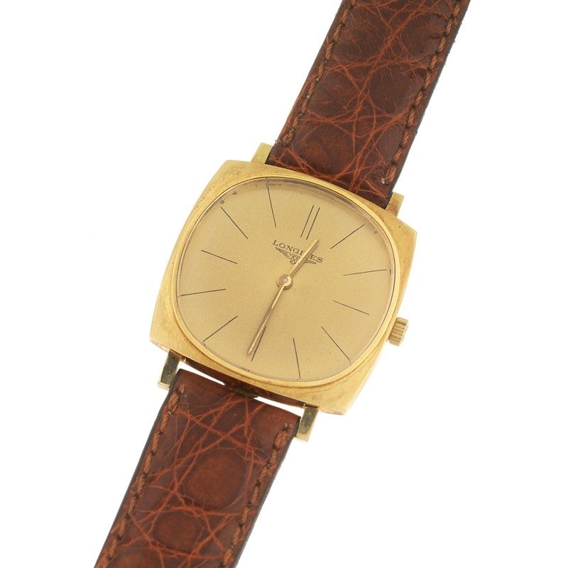 LONGINES OROLOGIO DA POLSO N.175500XX cassa di forma in oro giallo 18kt, fondello a pressione, corona marcata, quadrante champagne, indici stampati, movimento a carica manuale cal L 847.4 n. 52938271, cinturino in pelle marrone con fibbia in metallo dorato non originali, vetro minerale, gr. 38. Dim. mm 32x32. Corredato di scatola.