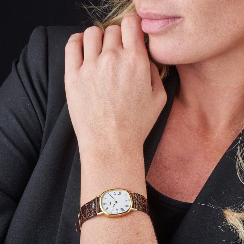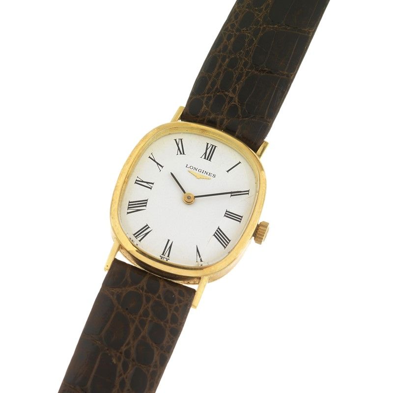 cassa di forma in oro giallo 18kt, fondello a pressione, corona marcata, lunetta liscia, quadrante bianco, grafica nera, numeri romani, movimento a carica manuale, cinturino originale in pelle marrone con fibbia in metallo dorato marcata Longines, vetro minerale, gr. 24. Dim. mm 25x28