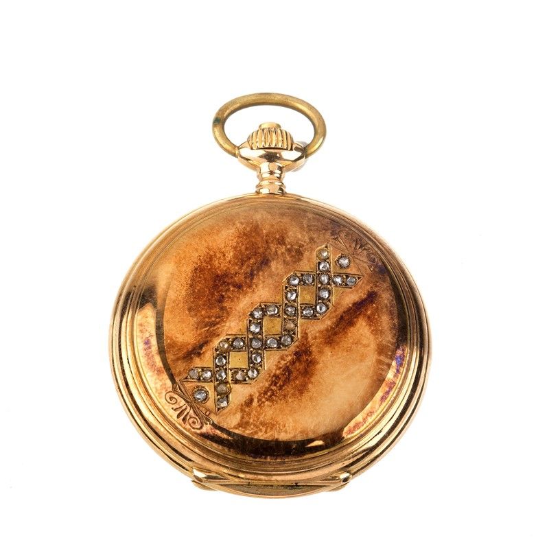 cassa in tre parti in giallo 18kt, fondello con stemma centrale e personalizzazione in lettere "D.E", "C.M", coperchio impreziosito da intreccio con rose di diamante, quadrante bianco, numeri romani, secondi a ore sei, lancette a foglia, movimento a carica manuale, gr. 35. Diam. mm 35LONGINES YELLOW GOLD POCKET WATCH N. 6890XX