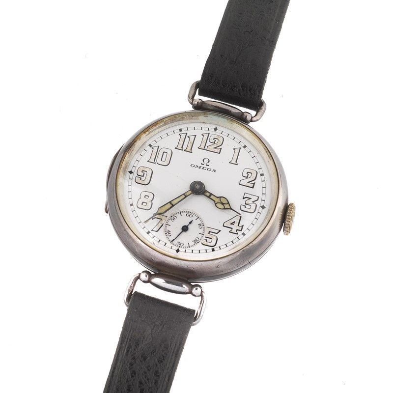 OMEGA OROLOGIO IN ARGENTO N. 57137XX cassa a cerniera in due parti in argento 900, anse fisse, quadrante in porcellana, grafica nera, numeri arabi stampati, secondi a ore sei, movimento a carica manuale n. 4927805, cinturino in pelle nera con fibbia in metallo non originali, vetro minerale. Diam. mm 34