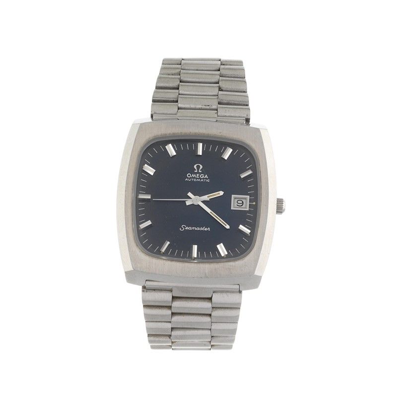cassa in acciaio, fondello serrato con viti, ghiera liscia in acciaio satinato, corona marcata, quadrante blu ristampato, grafica bianca, indici applicati, datario a ore tre, movimento a carica automatica cal 1012, bracciale a maglie in acciaio, lungh. interna cm 19, chiusura a scatoletta marcata Omega, vetro minerale. Diam. mm 37x39. Corredato di scatola non coeva.