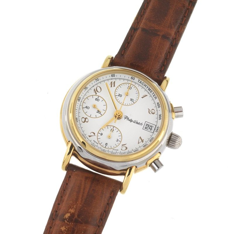 cassa in acciaio, fondello a pressione, tasti del crono a pompa, anse e lunetta placcate in oro, scala tachimetrica sul disco rehaut, quadrante bianco, grafica nera, tre contatori, movimento a carica automatica, cinturino in pelle marrone con fibbia in metallo dorato marcati Philip Watch, vetro minerale. Diam. mm 36. Corredato di scatola.