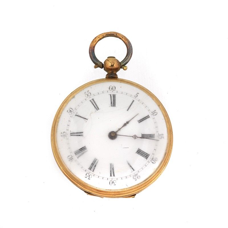 cassa in oro a basso titolo, quadrante bianco, numeri romani e arabi, movimento a carica a chiavetta, gr. 20. Diam. mm 32