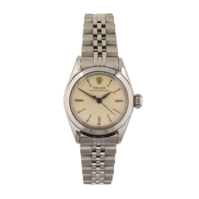 cassa in acciaio, fondello serrato a vite marcata 6623-6618, corona marcata, ghiera liscia, quadrante argentè, grafica nera, indici applicati, movimento a carica automatica cal 1130, bracciale jubilee non coevo, lungh. interna cm 18 circa, chiusura a scatoletta in acciaio marcata Rolex, vetro plastica. Diam. mm 24.