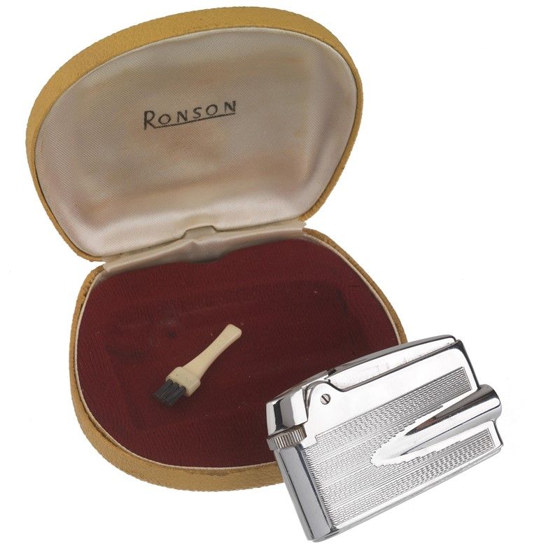 in metallo recante decorazione guillochè, firmato Ronson, dim. cm 6x3,5,1. Corredato di scatola e pennellino.