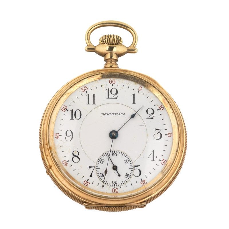 WALTHAM OROLOGIO DA TASCA N. 81751XX cassa in due parti in oro giallo a basso titolo, fondello guillochè con stemma, quadrante bianco in porcellana, grafica nera e rossa, numeri arabi, secondi a ore sei, movimento a carica manuale n. 16092825, gr. 100. Diam. mm 50
