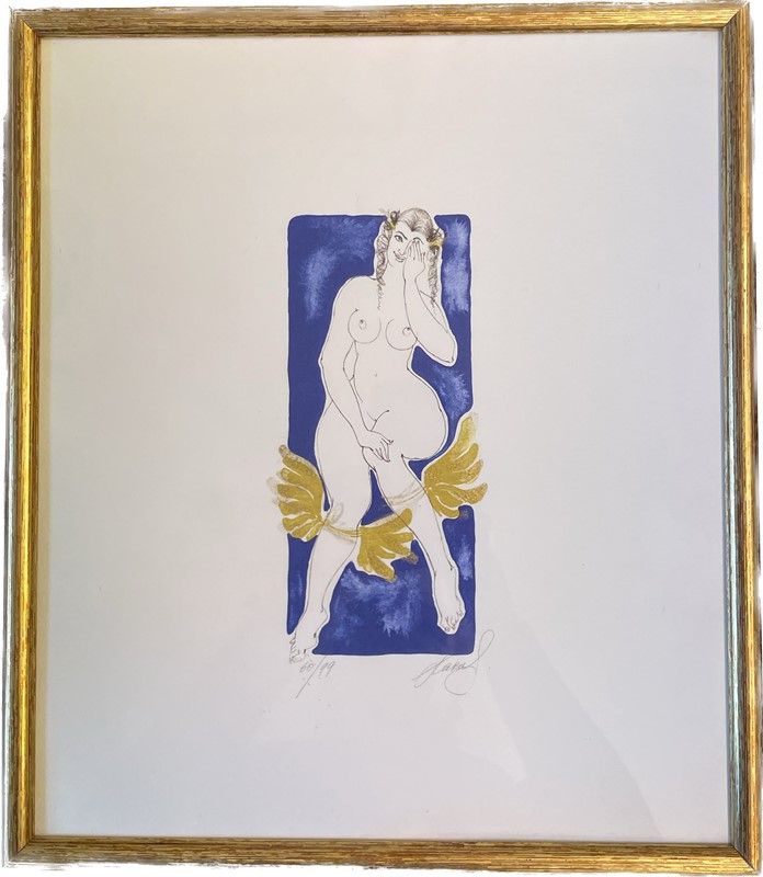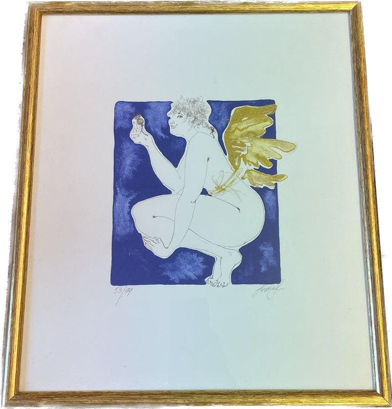 Lara Simonof (1967), coppia di litografie a colori, dalla serie delle “Vedute sull’anima” (2018), raffiguranti figure femminili nude e alate, firmate e numerate rispettivamente, “53/99” e “60/99”; entro cornici, cm 38x32