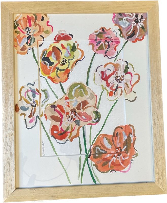 2 acquerelli dipinti in policromia con steli di fiori, opera della donatrice, entro cornici in legno chiaro, cm 43x33 e cm 33x27