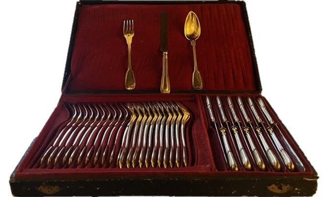 Servito di posate da dessert in argento dorato cesellate con pannelli cuoriformi composto da 12 forchette, 12 cucchiai e 12 coltelli, sec.XIX, entro astuccio in cuoio e metallo coevo, cm 6x40x25