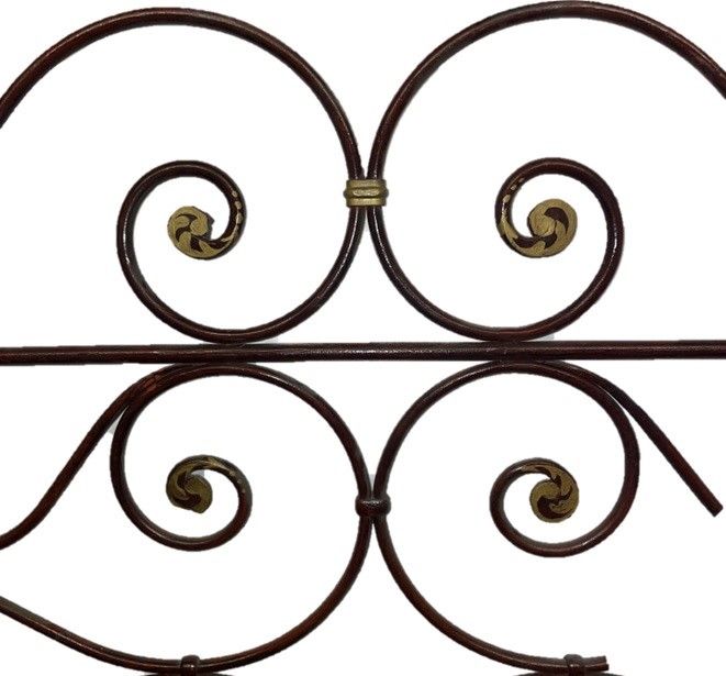 DA DISPOSIZIONE EREDITARIA Letto in ferro battuto dipinto a fondo rosso ruggine e lumeggiato a oro, testiera e parte inferiore interamente decorati a traforo con volute contrapposte, finali sferici in ottone, piedi a rotelle, prima metà sec. XIX, completo di sponde laterali, largh. cm 174 circa