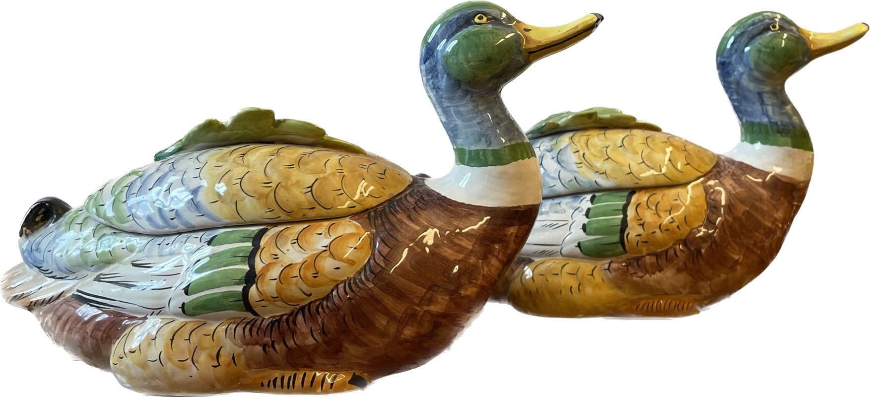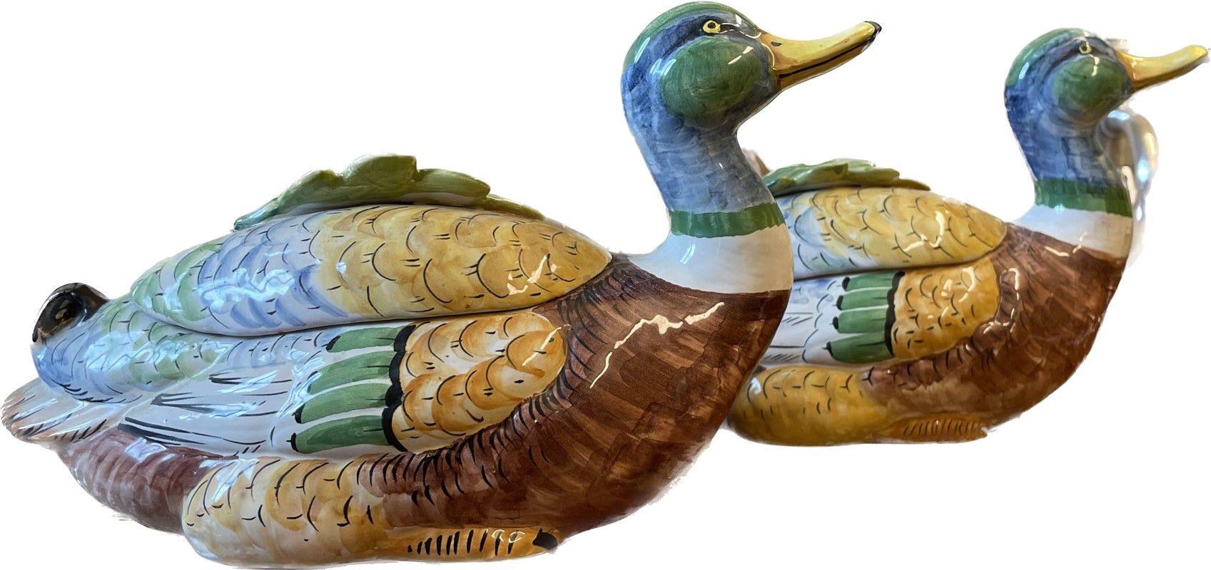 Coppia di zuppiere in forma di anatre in maiolica dipinta in policromia, h cm 17x33x14