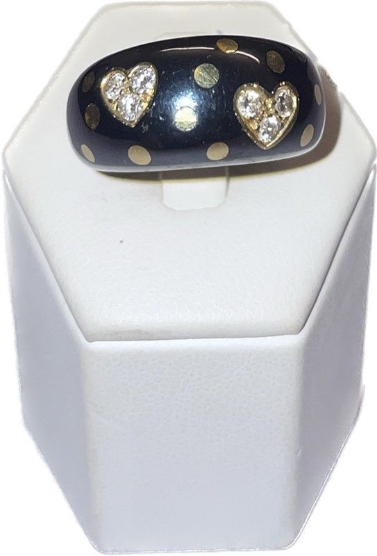 Anello bijoux a fascia smaltato nero e pois color oro con piccoli cuori con strass