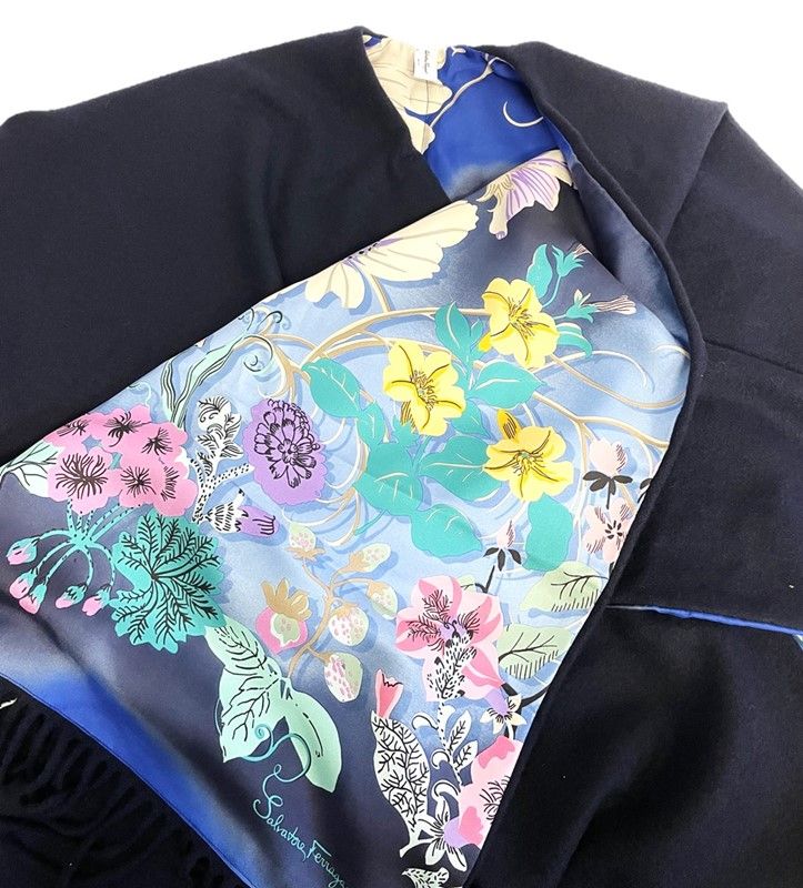 Stola in cashmere e lana con frange di colore blu e foderato in seta floreale