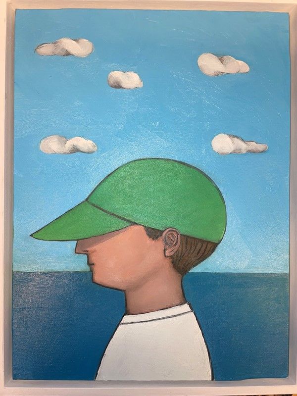 Ragazzo con cappello davanti al mare, olio su tela, firmato e datato sul retro 2023, cm 40x30