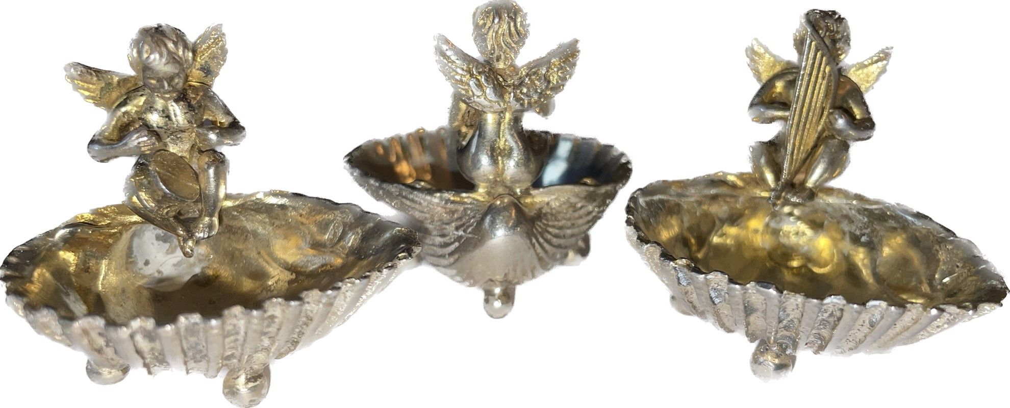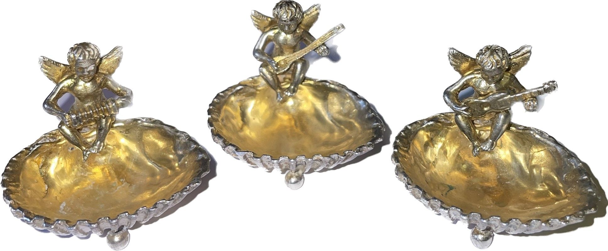 Serie di 6 saliere a conchiglia in argento sormontati da puttini musicanti, piedini a sfera, h cm 3,5x4