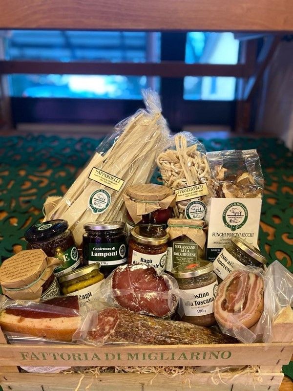 Prodotti della Fattoria di Migliarino (Pisa): prosciutto di maiale intero, trancio di prosciutto, prosciutto di tacchino disossato, prosciutto di tacchino a violino, salame di maiale, salame di cinghiale, mezzina , bresaola di tacchino, pancetta arrotolata, bocconcini di maiale, salamella dolce e salamella piccante, salsicce di maiale fresche, pepine fresche