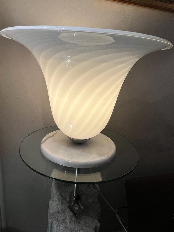 Grande lampada in vetro lattimo su base in marmo bianco, Italia. 1960, h cm 38 Ø cm 50, base in marmo Ø cm 30