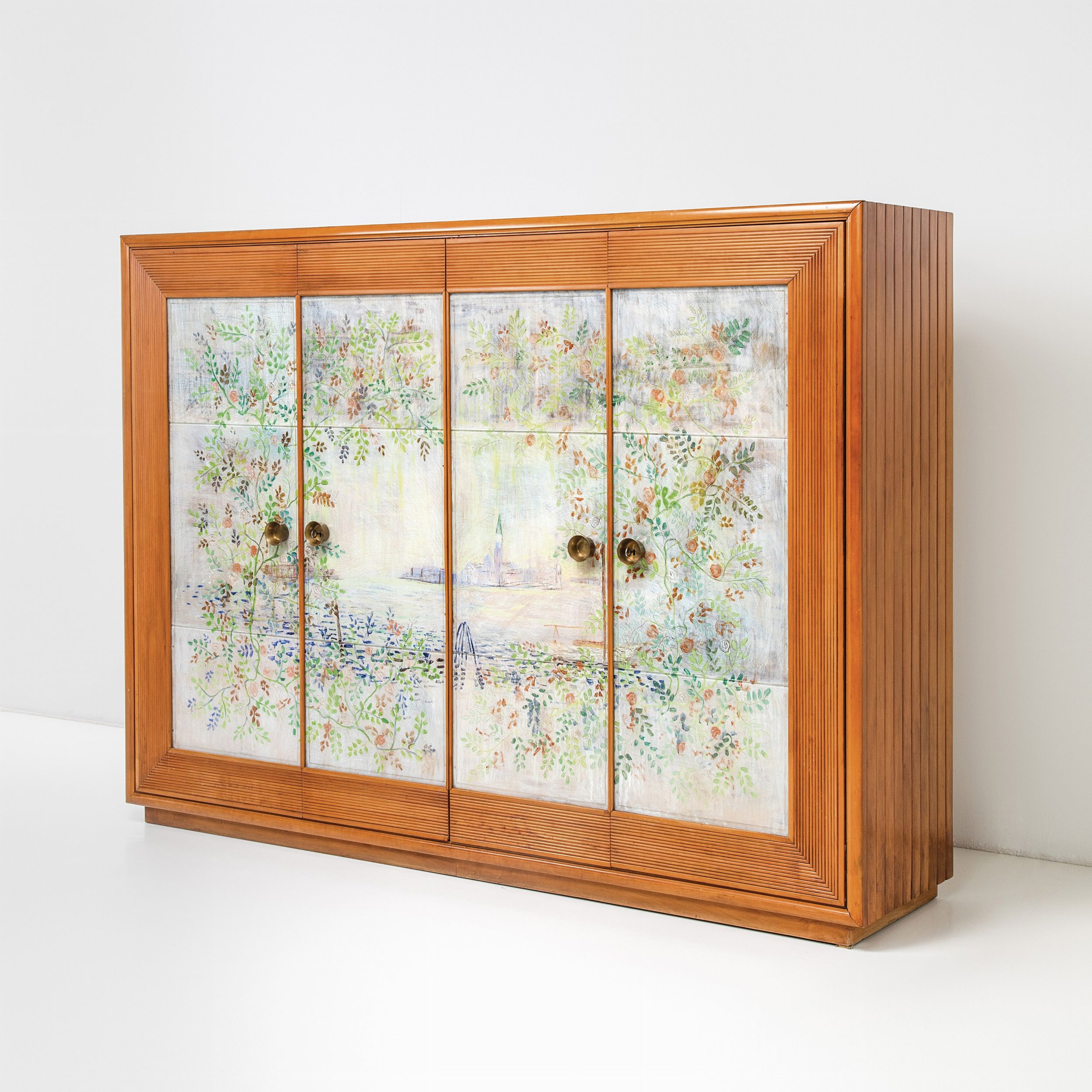 Struttura in legno e legno grissinato. Ante con decoro dipinto ad opera di Adriano Spilimbergo. Maniglie in ottone.
