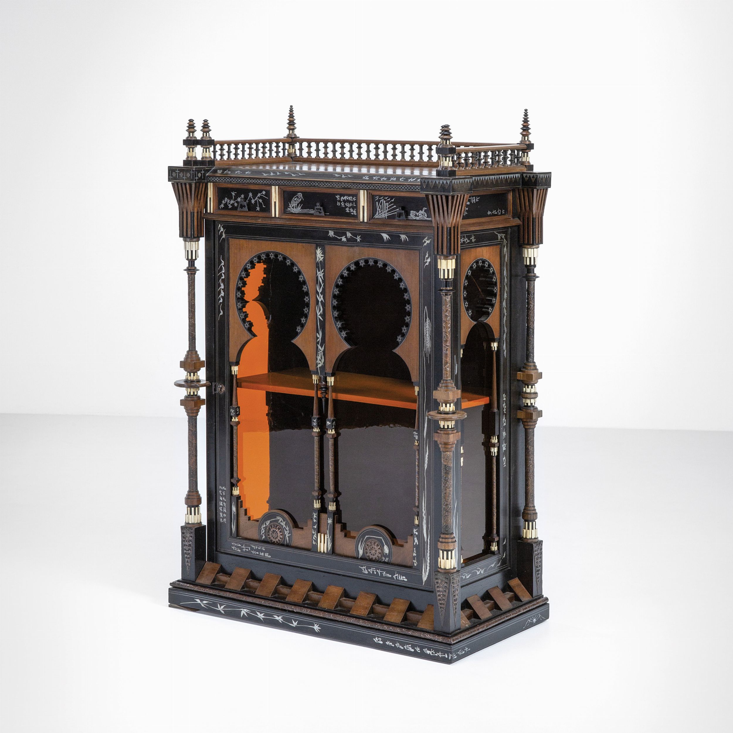 Largh. 93,4 - Prof. 47 - Alt. 138 Cm Struttura in legno in diverse essenze e legno intarsiato con ante in vetro. Decori in peltro, osso e vetro colorato. Applicazioni in rame sbalzato. Rivestimento della mensola interna in pergamena. Chiave e maniglie decorate con le iniziali di Bugatti. Prod. Bugatti, Italia, 1900 ca.