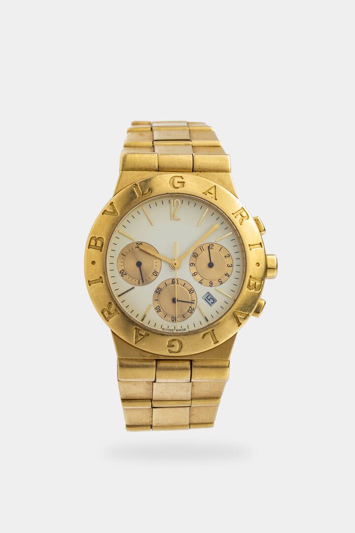 Diam. 36 mm Cassa in oro giallo con fondello a pressione. Quadrante panna con indici geometrici applicati secondi continui al 6 30 minuti cronografici al 9 e 12 ore al 3. Bracciale in oro integrato con chiusura a scomparsa. Movimento al quarzo.