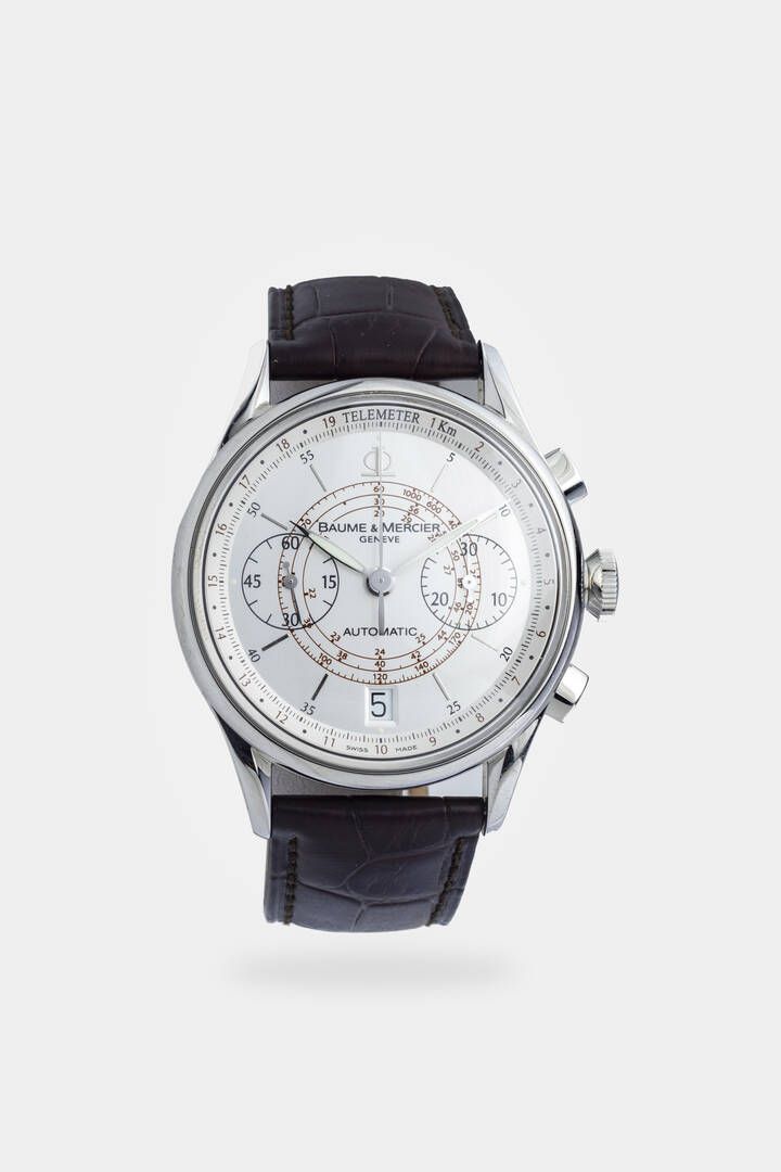 Diam. 39 mm Cassa in acciaio con fondello a scatto. Quadrante argento con indici geometrici applicati contatore dei secondi continui al 9 e dei 30 minuti cronografici al 3. Movimento a carica automatica. Orologio mai indossato completo di scatola controscatola libretto e garanzia card.
