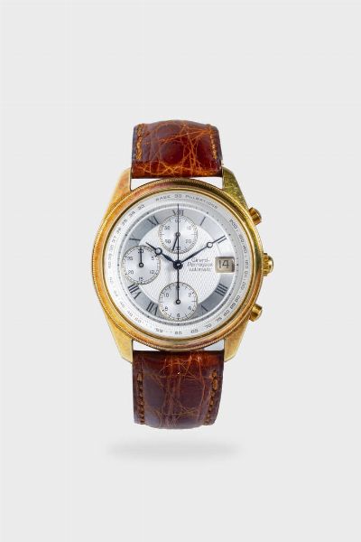 Diam. 38 mm Cassa in oro con fondello a scatto. Quadrante pulsometrico argentato e bitonale. Presente ad ore 3 il datario al 6 il contatore delle 12 ore al 9 quello dei 30 minuti cronografici ed al 12 quello dei secondi continui. Movimento a carica automatica cal.800-164