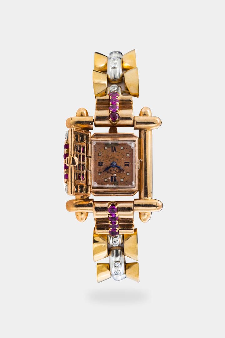 22x23 mm Peso gr 58.9 Cassa in oro rosa lavorata con copri quadrante in diamanti e rubini. Quadrante salmone con numeri romani serigrafati ai quarti. Bracciale integrato con maglia centrale con diamanti. Movimento a carica manuale.