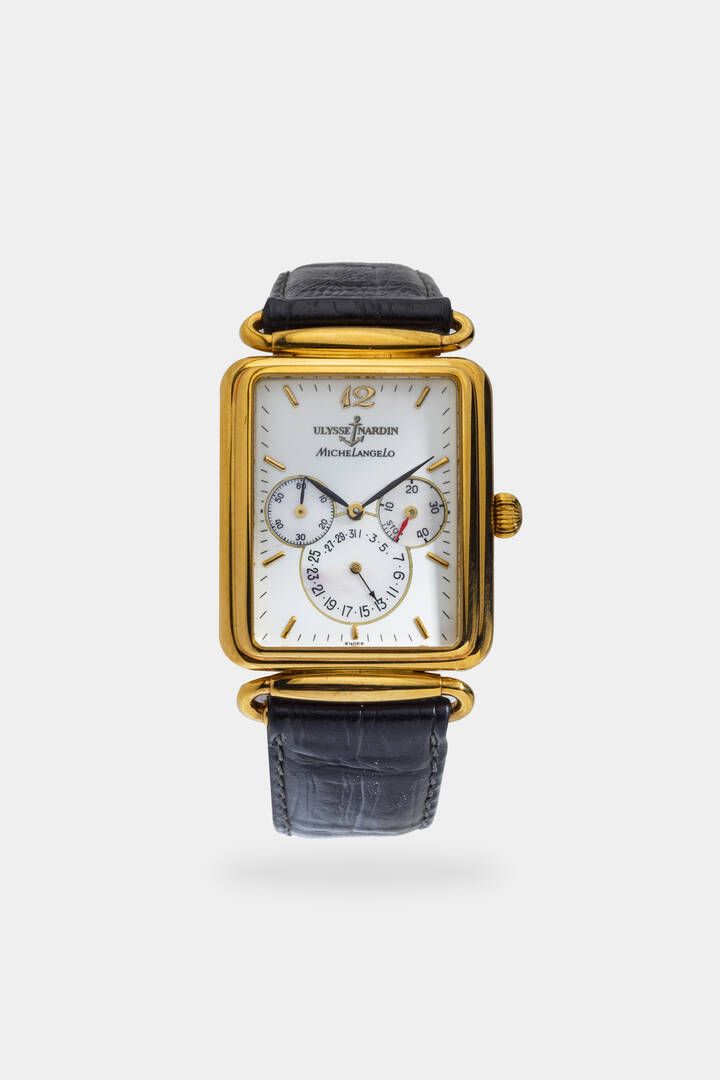 30x40 mm Cassa di forma in oro con fondello a vista. Quadrante bianco con indici geometrici applicati e subcontatori con sfondo effetto madreperla indicanti al 3 la riserva di carica al 6 la data ed al 9 l'indicazione dei secondi continui.