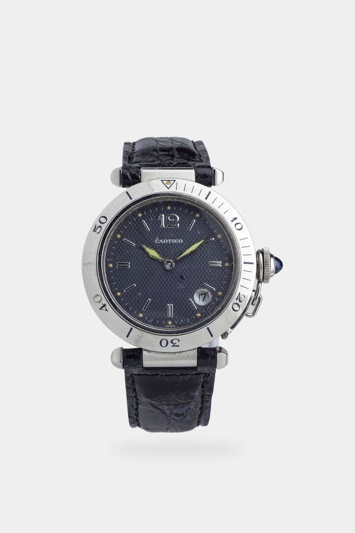 Diam. 38 mm Cassa in acciaio di forma con fondello avvitato e zaffiro cabochon sulla corona di carica. Quadrante grigio lavorato tapisserie con indici geometrici applicati e datario al 5. Movimento a carica automatica.