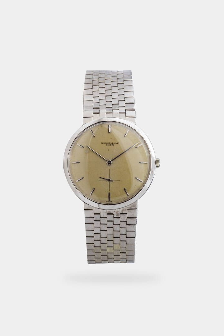 Diam. 33 mm Cassa in oro bianco con fondello a presione. Quadrante argento ocn indici geometrici applicati e indicazione secondi continui al 6. Bracciale in oro bianco integrato con chiusura a scomparsa. Movimento a carica manuale.