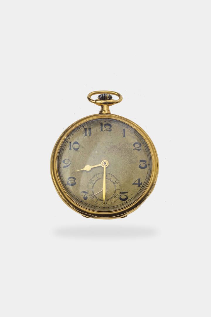 Diam. 47 mm Peso gr 56 2 Cassa in oro giallo con cuvette in metallo dorato. Quadrante giallo con numeri romani serigrafati e minuteria a binario periferica. Movimento a carica manuale. Non funzionante