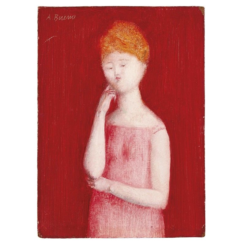 ANTONIO BUENO (Berlino 1918 - Fiesole 1984) La Pensosa 1973 ca. olio su faesite cm 20,5x15 firmato in alto a sinistra al retro firmato e dedicato