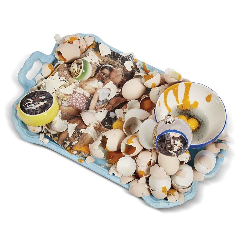 Le opere presentate sono due lavori iconici, in cui è possibile ritrovare tutti gli elementi stilistici dei maestri della ceramica: le uova sgusciate ammassate, le palline di Natale con sopra rappresentate vignette del Kamasutra, contenitori usurati di beni di consumo come lattine di birra o detersivi. In entrambe le opere è evidente la loro abilità nel saper rivelare le contraddizioni di questo tempo, il nostro tempo, e la caoticità della vita postmoderna. Tutto ciò è reso possibile anche grazie all’ausilio della ceramica, materiale fragile e al contempo eterno per eccellenza, e attraverso il quale Bertozzi&Casoni manipolano modalità espressive ibride e polimorfe, con la tenace volontà di favorire l’osmosi tra arte e vita, tra surrealismo compositivo e iperrealismo formale.
