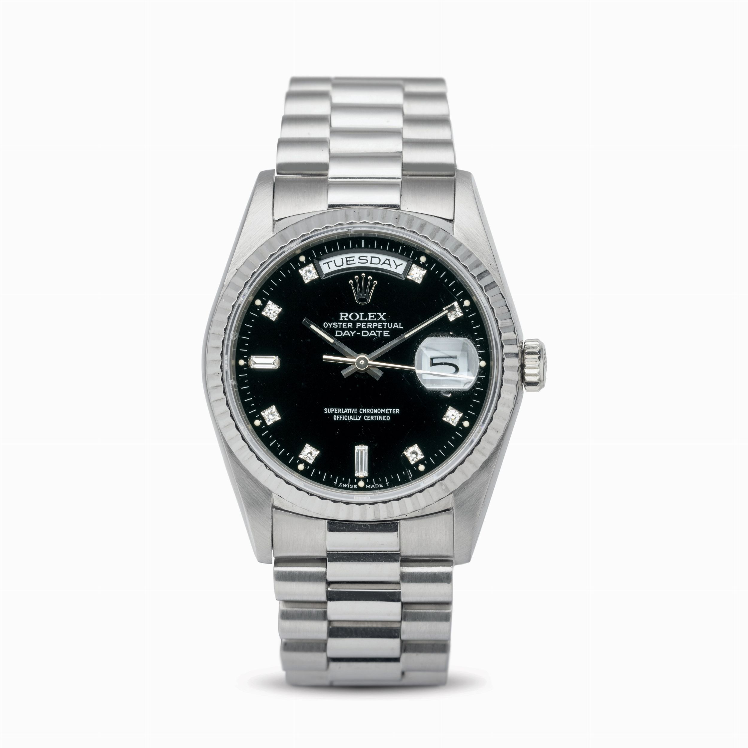 Daydate ref 18239 in oro bianco 18k, quadrante nero lucido con indici in brillanti, [..]