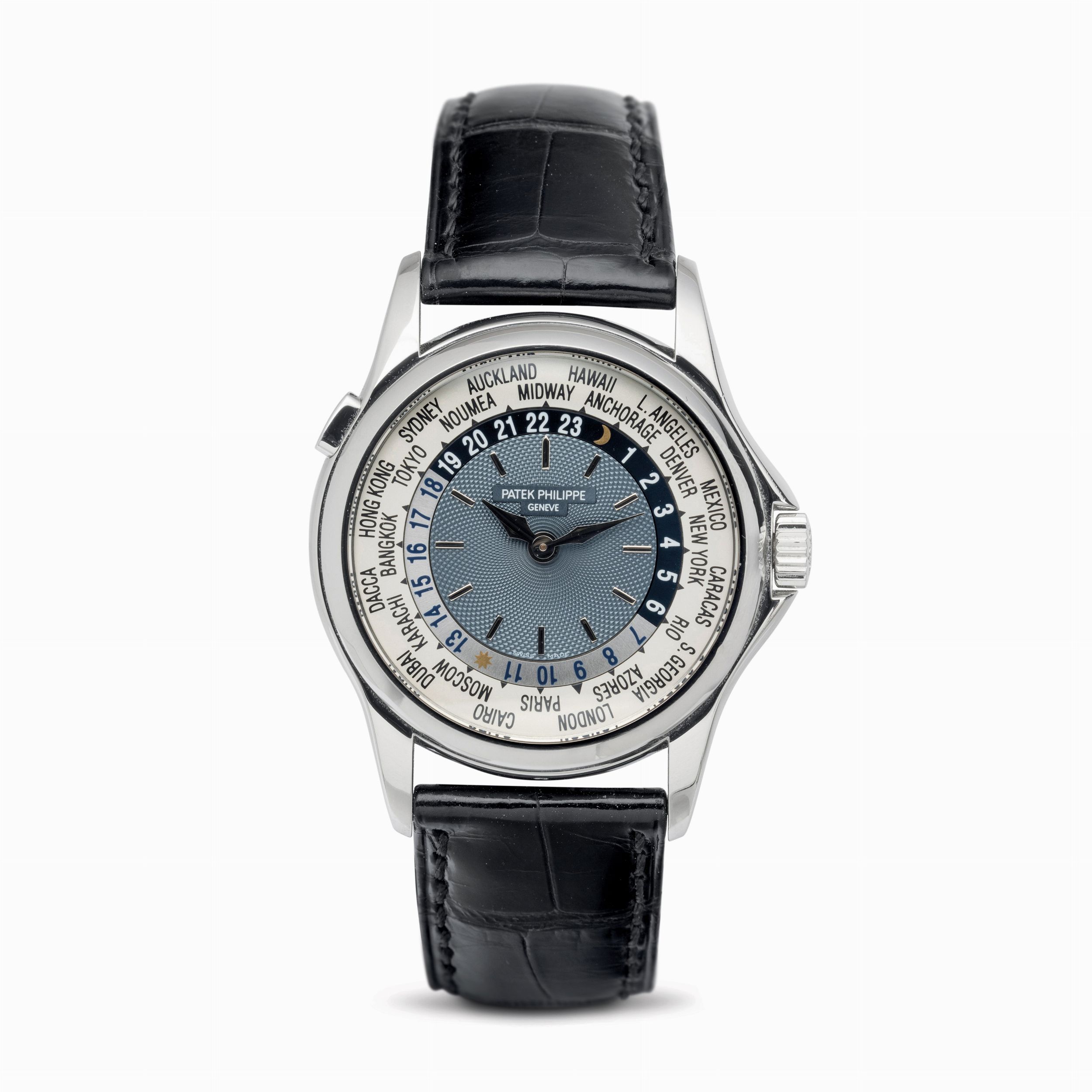 Marchio: Patek Philippe Modello: Worldtime Anno: circa 2002 Referenza: 5110 P Quadrante: Azzurro Guillochè Cassa N°: 4.112.xxx Movimento: Automatico Movimento N°: 3.208.xxx Materiale: Platino 750 Cinturino: Pelle Dimensione: 37 mm