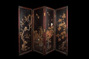 h cm 182 x l cm 265 Giappone, periodo Meiji (1868-1912) Composto da quattro ante, è finemente decorato con incisioni [..]