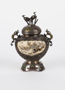 h cm 14,5 x l cm 11,4 x p cm 8,3 Giappone, periodo Meiji (1866-1912) Sorretto da un'elegante base in argento [..]