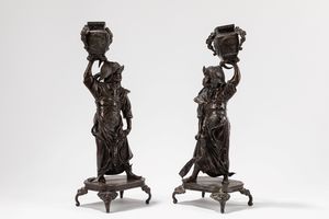 h cm 42 Giappone, periodo Meiji (1868-1912) Stanti su basi a quattro piedi a guisa di animali fantastici, raffigurano [..]