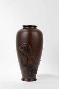 h cm 69 Giappone, periodo Meiji (1868-1912) Raffigurante una garzetta con dettagli in shakudo e dorature, poggiante [..]